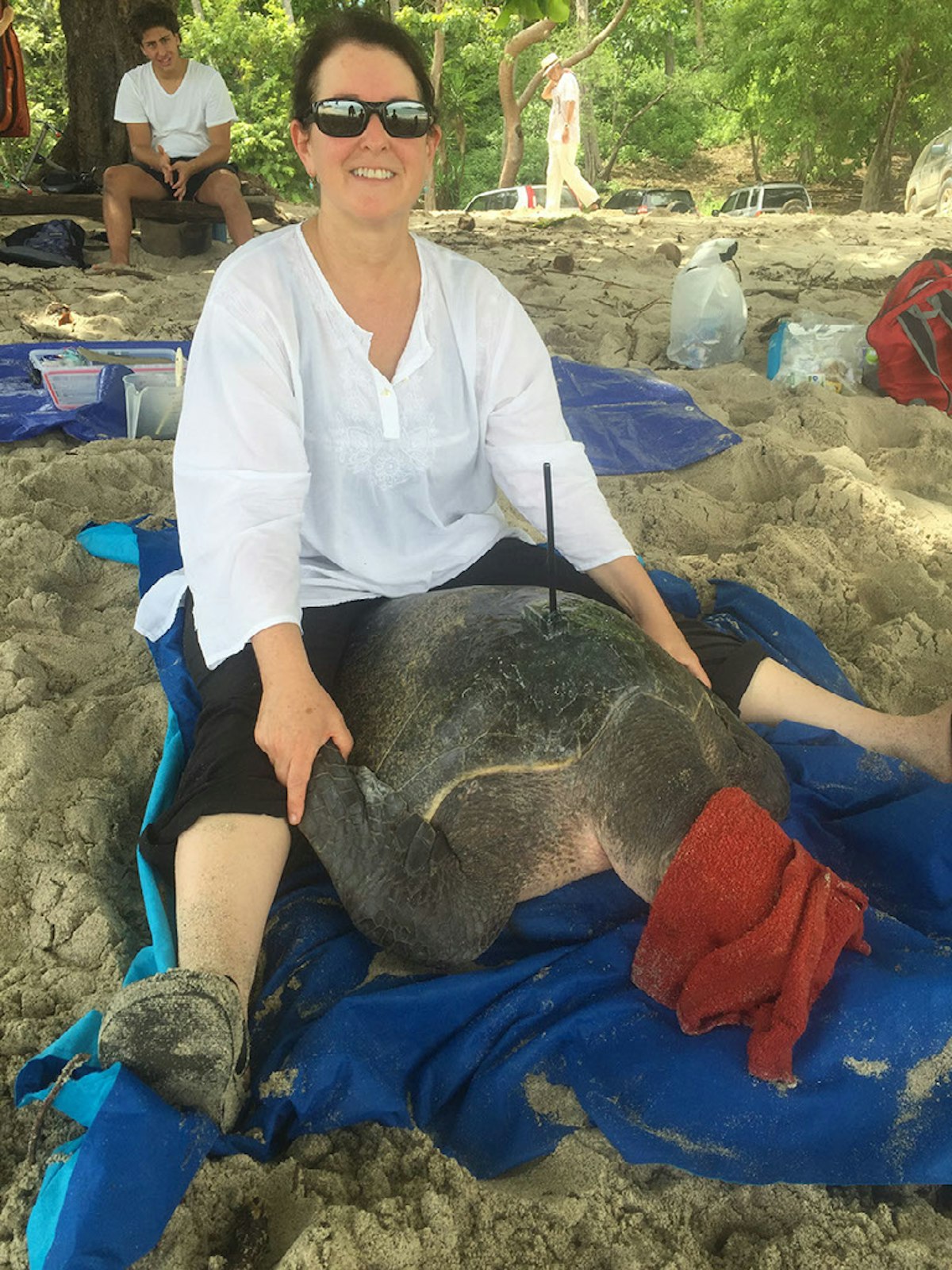 Sea turtle biologist Pam Plotkin sits with an olive ridley sea turtle, waiting for its satellite transmitter to dry.