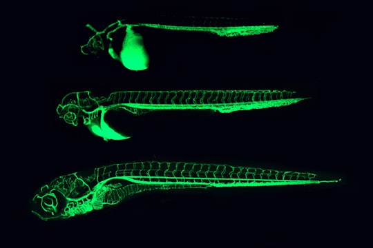 Zebrafish larva bioengineered two have blood vessels glow in red and blood vessel cell nuclei in green